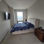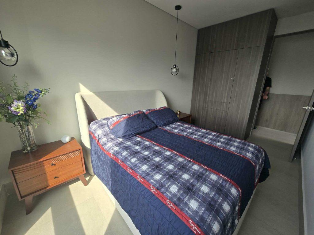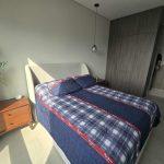 - Recamara secundara con cama Queen, 2 buros, TV y 2 lamparas colgantes. closed de pared